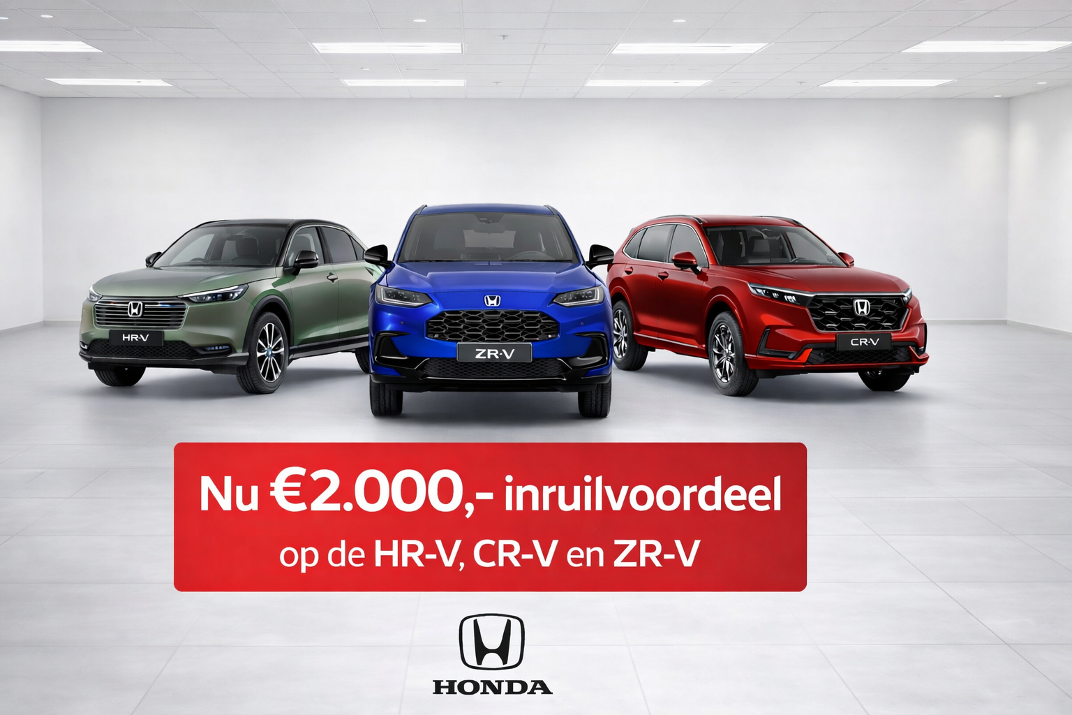 Profiteer van € 2.000 voordeel op voorraadmodellen van de HR-V Full Hybrid, ZR-V Full Hybrid en CR-V Plug-in Hybrid